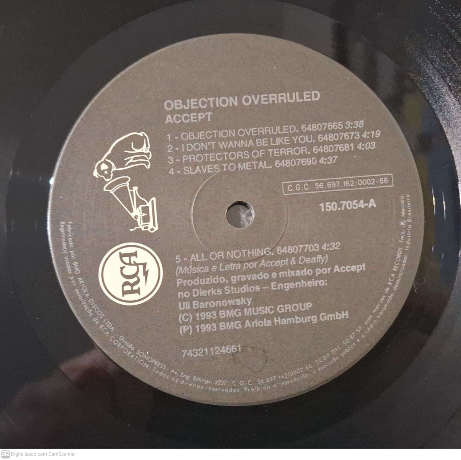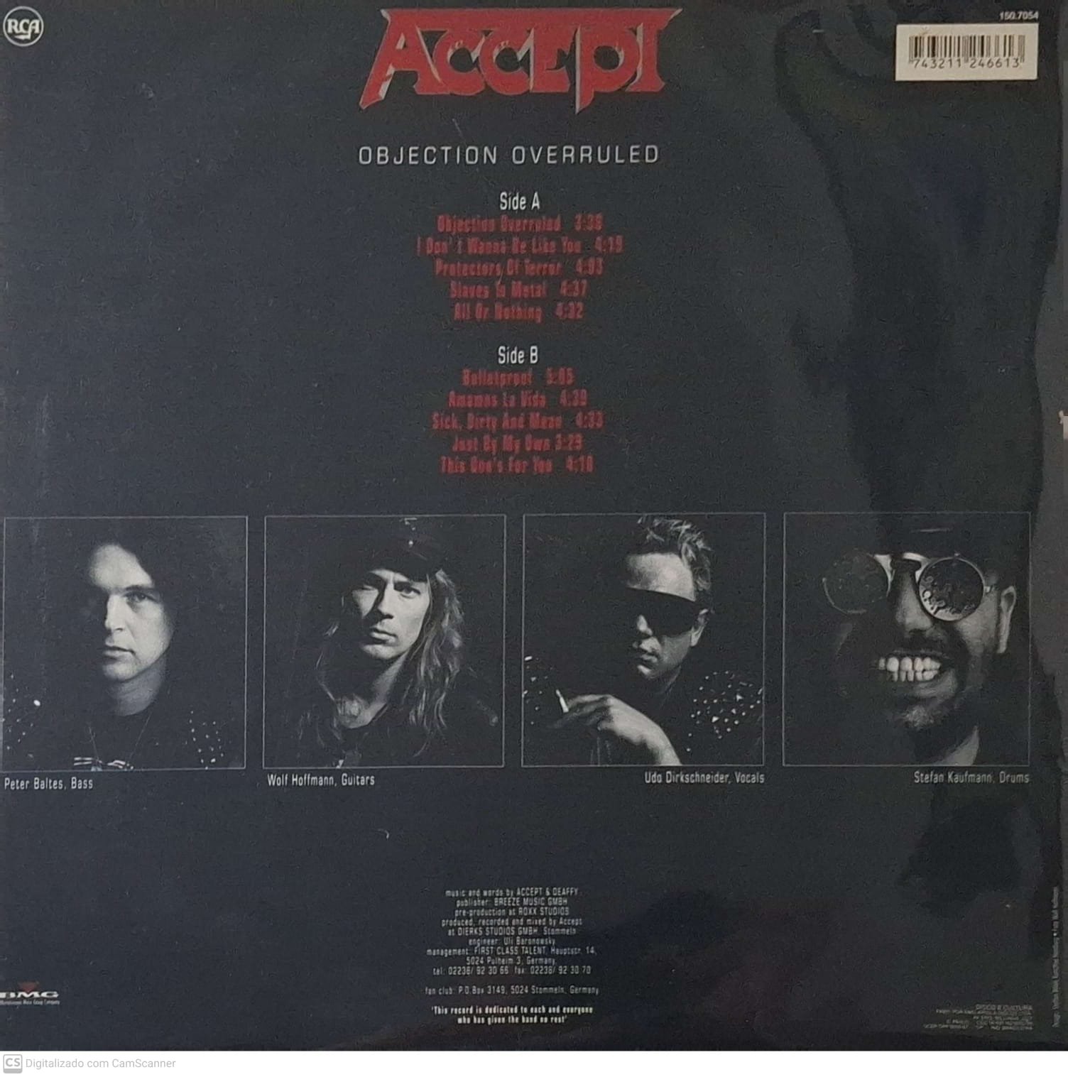 Lançado em 1993, Objection Overruled é o nono álbum de estúdio do Accept e representa um marco importante na trajetória da banda alemã de heavy metal. O disco marca o aguardado retorno de Udo Dirkschneider aos vocais principais, retomando a formação clássica que havia se desfeito após Russian Roulette (1986). Gravado em estúdio próprio e mixado no tradicional Dierks Studios, o álbum traz um som direto e poderoso, com riffs marcantes e letras que resgatam a essência do Accept nos anos 80. Faixas como “Slaves to Metal” e a própria “Objection Overruled” se destacam como hinos da volta às raízes, agradando especialmente os fãs da velha guarda.