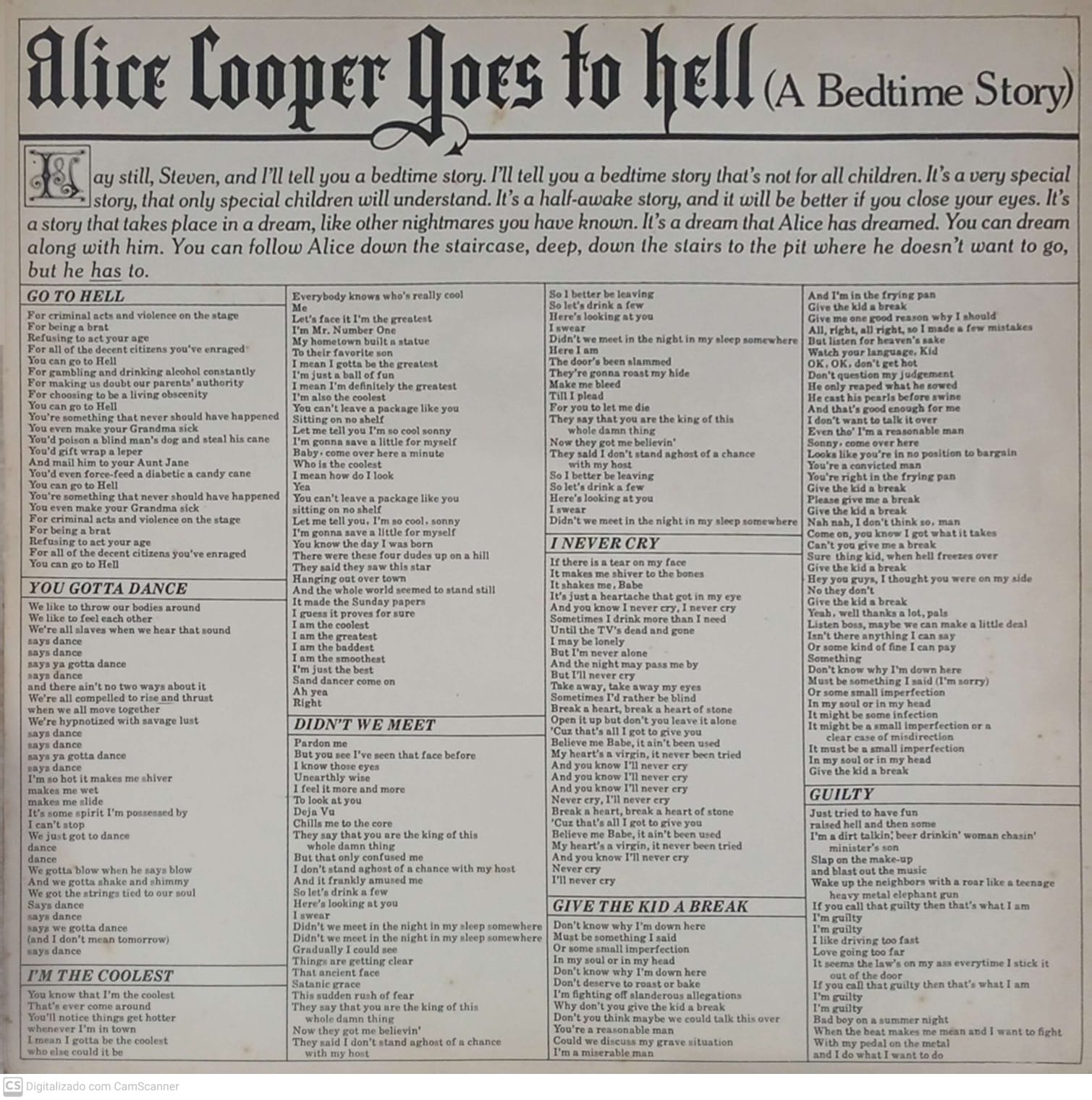 Lançado em 1976, Goes to Hell é o segundo álbum solo de Alice Cooper e funciona como uma sequência direta do clássico Welcome to My Nightmare (1975). Combinando teatralidade, rock dramático e baladas sombrias, o disco segue a jornada do personagem Steven enquanto é lançado ao inferno – literalmente e metaforicamente. A faixa “I Never Cry”, um dos maiores sucessos da carreira de Alice, é uma balada emocional escrita durante um período de luta contra o alcoolismo. A produção leva a assinatura de Bob Ezrin, responsável também pela grandiosidade sonora do álbum anterior.